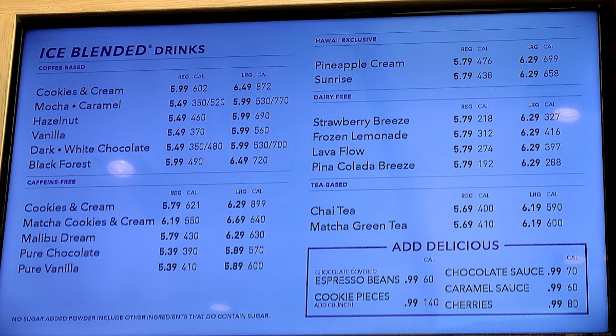 - Ice Blended Drinks: For a refreshing treat, try the Pure Cookies & Cream Ice Blended or the tropical Piña Colada Breeze, both at $7.69.